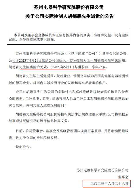 6月26日晚,深陷“父子內(nèi)斗”的蘇州電科院發(fā)公告稱,公司創(chuàng)始人胡德霖因病去世,享年72歲。