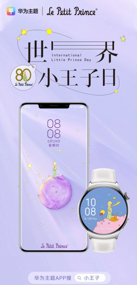 6月29日,華為手機發(fā)布微博,為慶?!缎⊥踝印穭?chuàng)刊80周年,華為推出小王子同款主題,用戶只需從華為主題App搜索“小王子”關鍵字即可下載相同的主題(需要付費6元),這次推出的主題有手機版和手表版。