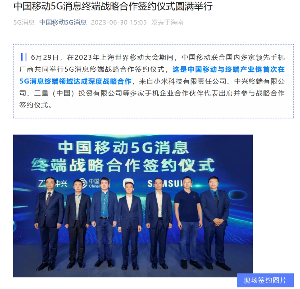 6月30日,2023上海世界移動通信大會期間,中國移動聯(lián)合國內(nèi)多家手機廠商共同舉行5G消息終端戰(zhàn)略合作簽約儀式,小米科技有限責任公司、中興終端有限公司、三星(中國)投資有限公司等多家企業(yè)參與,這是中國移動與終端產(chǎn)業(yè)鏈首次在5G消息終端領域達成深度戰(zhàn)略合作。