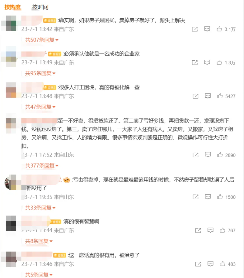 對此,不少網(wǎng)友表示贊同:“很多人打工困境,真的有被化解一些”“如果房子是困擾,賣掉房子就好了,源頭上解決”“這一席話真的很有用,被治愈了”......