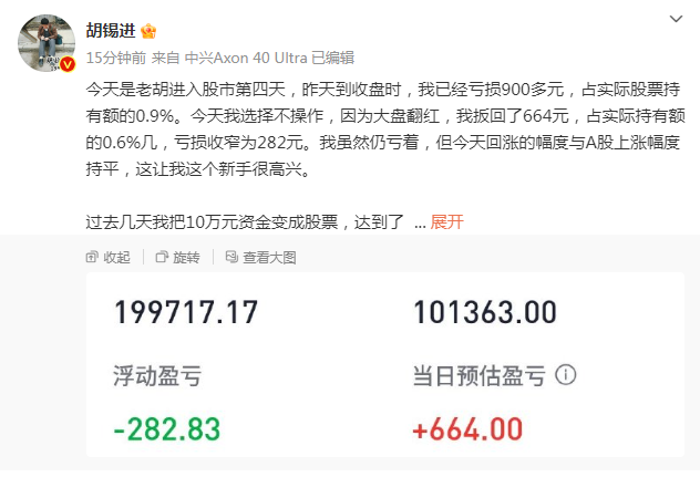 6月26日,胡錫進高調(diào)宣布,“下午辦了件大事——給自己股票開戶,正式進入中國股市,成為‘股民老胡’”,并希望自己能盈利,而不是成為新的“韭菜”。
