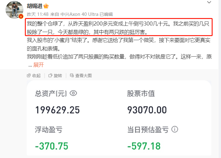 到了第三天,老胡就發(fā)微博稱,“自己整個倉都綠了,從昨天盈利200多元變成上午倒虧300幾十元”,并感慨入股市的“小蜜月”結(jié)束了。