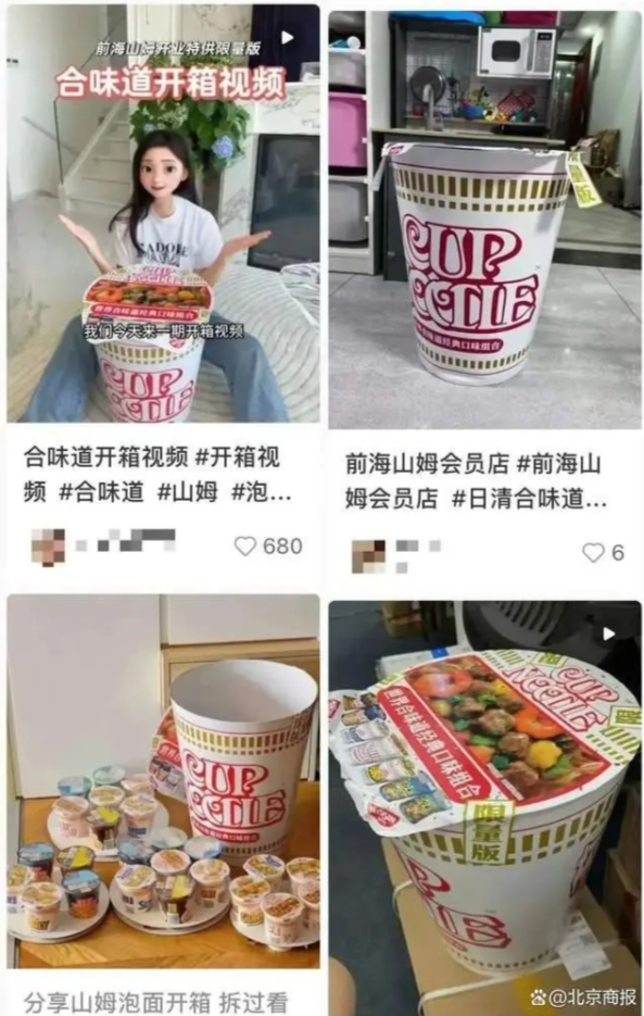 近日,深圳最大的山姆旗艦店開業(yè),限量售賣一款稱為“合味道泡面桶”的商品。這款方便面桶造型夸張,達(dá)到45cm,售價168元,每人限購2桶,其他城市沒有。