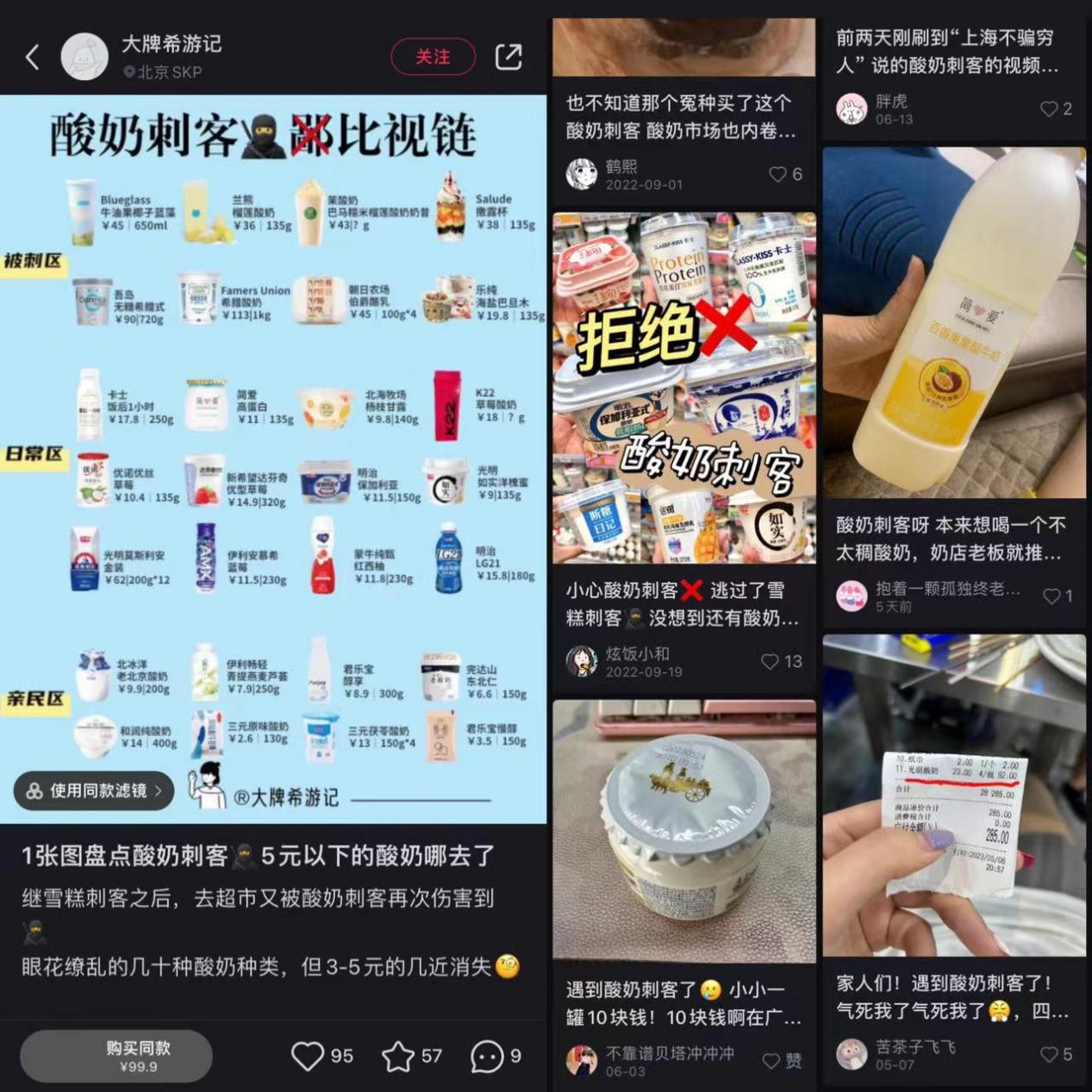 在小紅書搜索酸奶刺客,主要以避雷帖為主,甚至有網(wǎng)友配圖“酸奶刺客鄙視鏈”,大多數(shù)帖子都充斥著“受害者”的苦與淚。