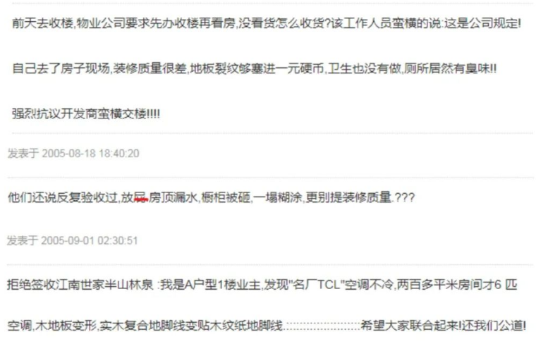 比如張勁的爆款樓盤“江南世家”,在2005年交房后,有很多業(yè)主上網(wǎng)曝光,房子質(zhì)量差,買房時的各種承諾沒落實,差評不斷。