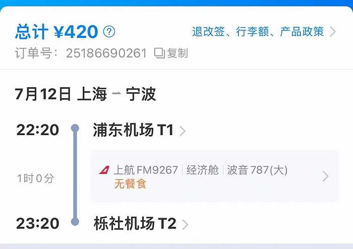 但如今,上航最近開(kāi)通了浦東-寧波航班,出發(fā)和返程的含稅票價(jià)都在420元,飛行時(shí)長(zhǎng)約一小時(shí)。而上海-寧波高鐵二等座144元,用時(shí)最短一個(gè)半小時(shí)。兩者時(shí)長(zhǎng)基本接近,但票價(jià)卻相差數(shù)倍,且火車站比機(jī)場(chǎng)更靠近市區(qū)。