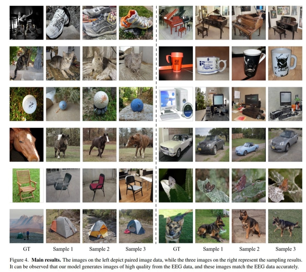 研究小組向6名受試者展示了2000張屬于40個(gè)不同對(duì)象類別的圖像,然后通過(guò)采集受試者的腦電圖信號(hào),制作出高質(zhì)量的圖像。下圖左邊每組標(biāo)有GT的是原圖,右邊的Sample圖是腦電圖生成的圖。