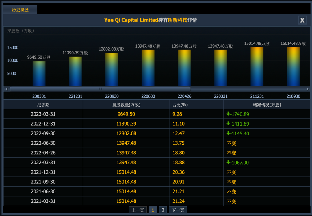 2022年9月30日,朗新科技公告,YUE QI減持計(jì)劃實(shí)施完畢,合計(jì)減持公司股份1145.4萬股,占公司總股份的1.09%;