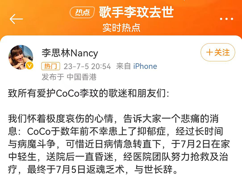 2023年7月5日晚間,歌手李玟的姐姐李思林在微博發(fā)文稱,CoCo(李玟)于數(shù)年前患上抑郁癥,近日病情急轉(zhuǎn)直下于2023年7月2日在家中輕生。李玟送醫(yī)治療后,最終于2023年7月5日與世長辭。