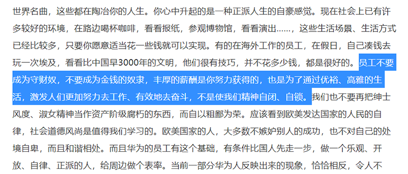 “員工不要成為守財奴,不要成為金錢的奴隸?!比握潜硎荆S厚的薪酬是努力獲得,也是為了獲得優(yōu)裕、高雅的生活,激發(fā)人們更加努力工作、有效地奮斗,不是精神自閉、自鎖。