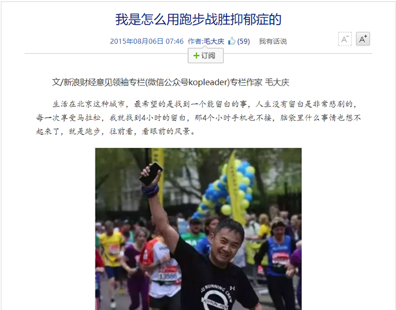我曾因抑郁癥而跑步,通過跑步把抑郁癥治好了”。優(yōu)客工場創(chuàng)始人兼董事長毛大慶此前提到,馬拉松或長跑對治療抑郁癥確實有作用。在跑步的歷程里,他碰到相當多因跑步治好抑郁癥的案例。