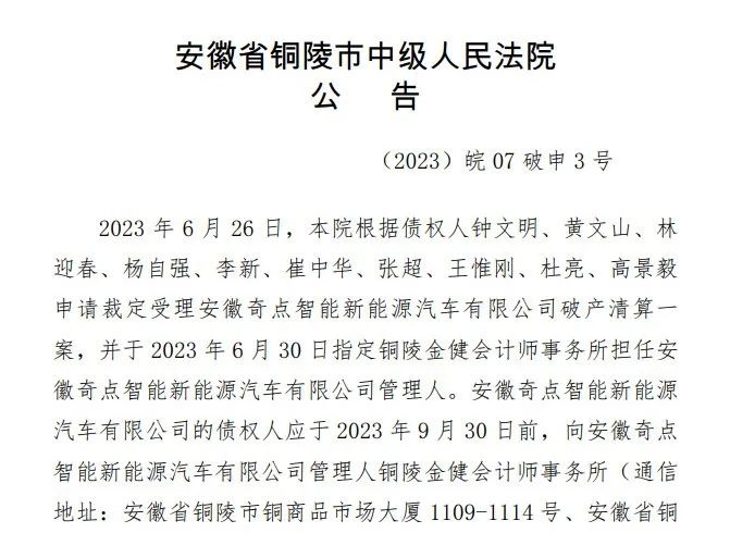 7月5日,安徽省銅陵市中級人民法院發(fā)布公告,2023年6月26日,銅陵中級人民法院根據(jù)債權人鐘文明、黃文山、等10人申請裁定受理安徽奇點智能新能源汽車有限公司破產(chǎn)清算一案,并于2023年6月30日指定銅陵金健會計師事務所擔任安徽奇點智能新能源汽車有限公司管理人。