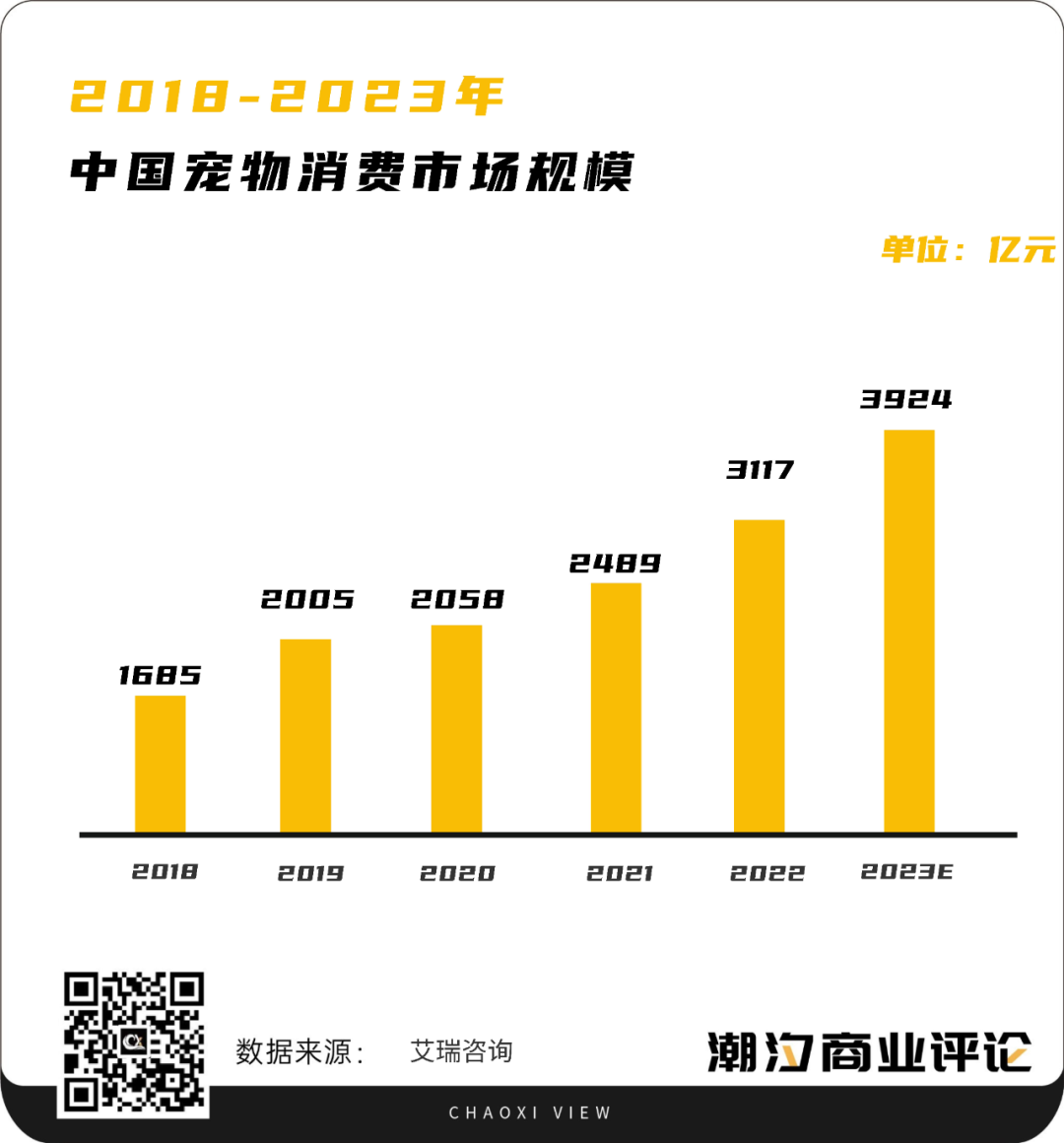 近年來,寵物市場規(guī)模不斷擴大,據(jù)不完全統(tǒng)計,目前中國寵物數(shù)量已超過1.16億只,寵物飼養(yǎng)率達到17%。艾瑞咨詢發(fā)布的《2023年中國寵物內(nèi)容價值研究白皮書》顯示,國內(nèi)寵物消費市場規(guī)??焖僭鲩L,2022年市場規(guī)模約為3117億元,預(yù)計2023年市場規(guī)模約為3924億元,涉及食品、用品、醫(yī)療、寄養(yǎng)等方面。