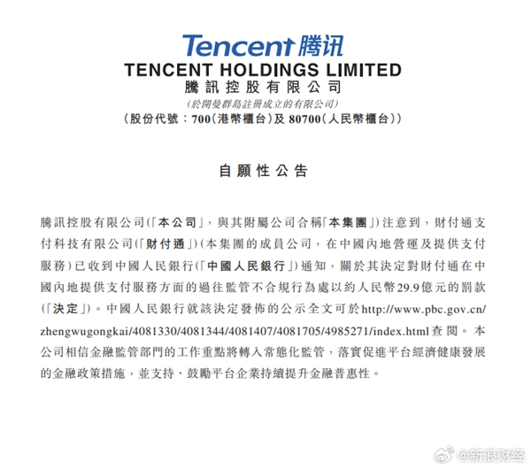 騰訊控股在港交所發(fā)布公告稱,公司相信金融監(jiān)管部門的工作重點將轉(zhuǎn)入常態(tài)化監(jiān)管,落實促進平臺經(jīng)濟健康發(fā)展的金融政策措施,并支持、鼓勵平臺企業(yè)持續(xù)提升金融普惠性。