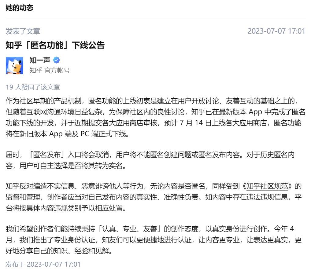 七月七日,知乎官方賬號(hào)“知一聲”發(fā)布了《知乎》「匿名功能」下線公告。
