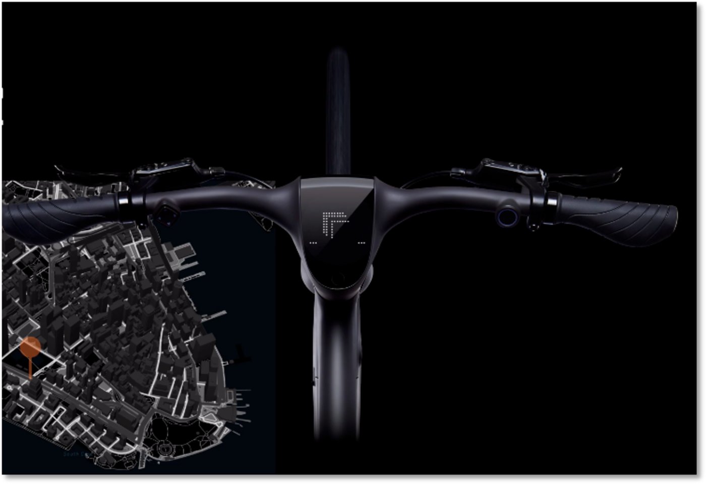 科技感體現(xiàn)在車把中間的LED點(diǎn)陣屏幕上,如下圖所示,騎行過程中,它會(huì)以箭頭的形式進(jìn)行實(shí)時(shí)導(dǎo)航,右側(cè)的車把會(huì)是“圓形鈕”它是一個(gè)類似老款iPhone的指紋解鎖按鈕,只需輕輕一觸就能啟動(dòng)自行車的電機(jī),并在騎行過程中提供電動(dòng)助力。