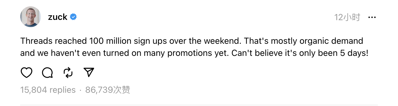 7月10日,Meta首席執(zhí)行官扎克伯格宣布,在剛剛過去的周末,該公司在Twitter上推出的新社交軟件Threads的注冊用戶數(shù)達(dá)到1億,Meta的股價收盤當(dāng)天上漲超過1%,接近一年半以來的最高水平。自上周三推出以來,Threads在5天內(nèi)增加了1億注冊用戶,打破了ChatGPT創(chuàng)下的最快用戶增長紀(jì)錄(兩個月用戶數(shù)達(dá)到1億)紀(jì)錄。