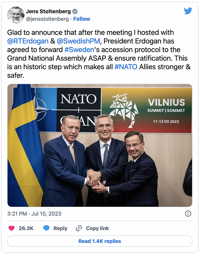 “在與土耳其總統(tǒng)和瑞典首相舉行了會議后,我很高興地宣布,埃爾多安總統(tǒng)已同意盡快將瑞典的入盟協(xié)議提交給大國民議會并確保其獲得批準(zhǔn)。這是歷史性的一步,它使所有北約盟友變得更強(qiáng)大、更安全”。斯托爾滕貝格在推特上寫道。