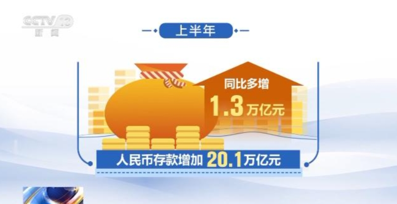 此外數(shù)據(jù)顯示,上半年人民幣存款增加20.1萬億元,同比多增1.3萬億元。
