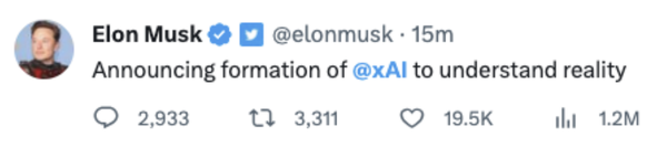 馬斯克發(fā)表上述言論的當(dāng)天,他推出了自己的人工智能初創(chuàng)公司“xAI”,與OpenAI競(jìng)爭(zhēng)。馬斯克成立xAI人工智能公司,目標(biāo)是理解“宇宙的真實(shí)本質(zhì)”。