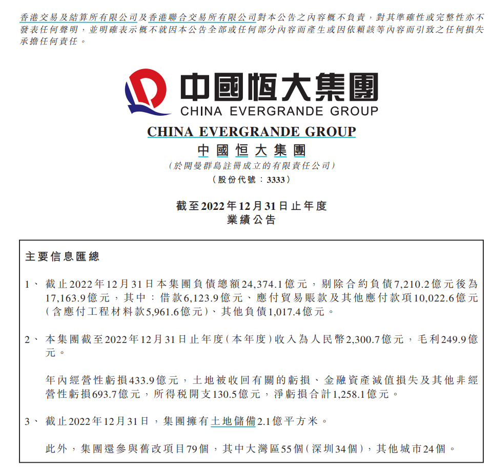 收入為2300.7億元,毛利249.9億元。經(jīng)營性虧損433.9億元,土地被收回有關(guān)的虧損、金融資產(chǎn)減值損失及其他非經(jīng)營性虧損693.7億元,所得稅開支130.5億元,凈虧損合計1258.1億元。