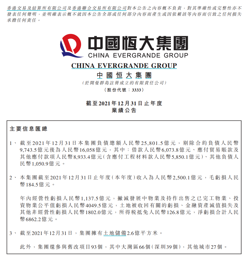 剔除合約負(fù)債人民幣9,743.5億元后為人民幣16,058億元。收入為人民幣2,500.1億元,毛虧損人民幣184.5億元。年內(nèi)經(jīng)營性虧損人民幣1,137.5億元,撇減發(fā)展中物業(yè)及持作出售之已完工物業(yè)、投資物業(yè)公平值虧損人民幣4049.5億元,土地被收回有關(guān)的虧損、金融資產(chǎn)減值損失及其他非經(jīng)營性虧損人民幣1802.0億元,所得稅抵免人民幣126.8億元,凈虧損合計人民幣6862.2億元。