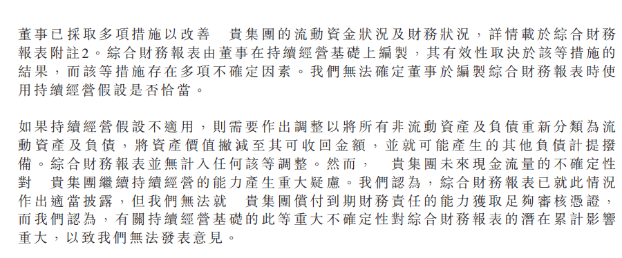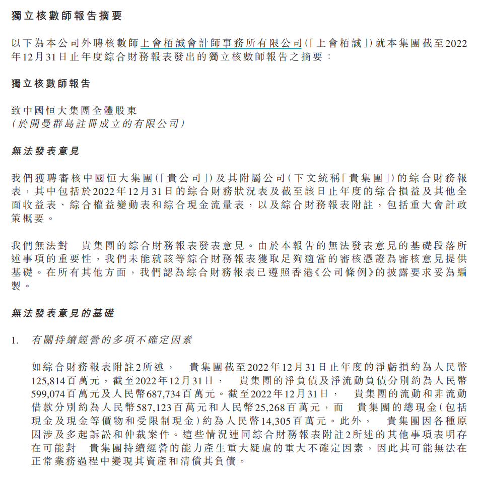 對這兩份年報,中國恒大的外聘核數(shù)師上會栢誠會計師事務(wù)所表示,對該年報無法發(fā)表意見?!爸袊愦笪磥憩F(xiàn)金流量的不確定性對集團(tuán)繼續(xù)持續(xù)經(jīng)營的能力產(chǎn)生重大疑慮。我們認(rèn)為,綜合財務(wù)報表已就此情況作出適當(dāng)披露,但我們無法就貴集團(tuán)償付到期財務(wù)責(zé)任的能力獲取足夠?qū)徍藨{證,而我們認(rèn)為有關(guān)持續(xù)經(jīng)營基礎(chǔ)的此等重大不確定性對綜合財務(wù)報表的潛在累計影響重大,以致我們無法發(fā)表意見?!?/span>