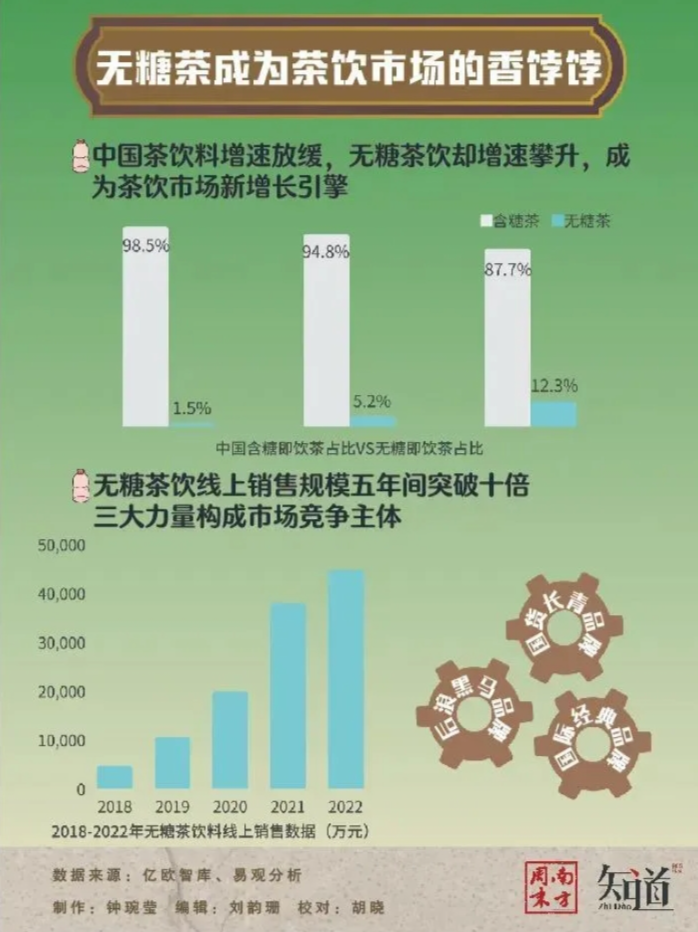 數(shù)據(jù)顯示,在某銷售平臺(tái)上,無糖茶飲線上銷售額五年間完成了近10倍的增長(zhǎng),在茶飲料市場(chǎng)占比逐步擴(kuò)大,無糖茶飲料正在接棒含糖茶,成為茶飲料市場(chǎng)的新增長(zhǎng)引擎。