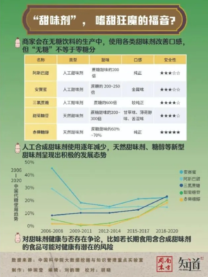 同時(shí),“無糖”“零糖”食品的流行引起人們對(duì)“0糖”標(biāo)識(shí)與各甜味劑的討論。比如對(duì)于代糖,中科院報(bào)告指出,天然甜味劑的市場(chǎng)占比正在逐年提升,相比之下,阿斯巴甜等人工甜味劑因?yàn)榘踩源嬉桑诒惶烊惶鹞秳┤〈?nbsp;
