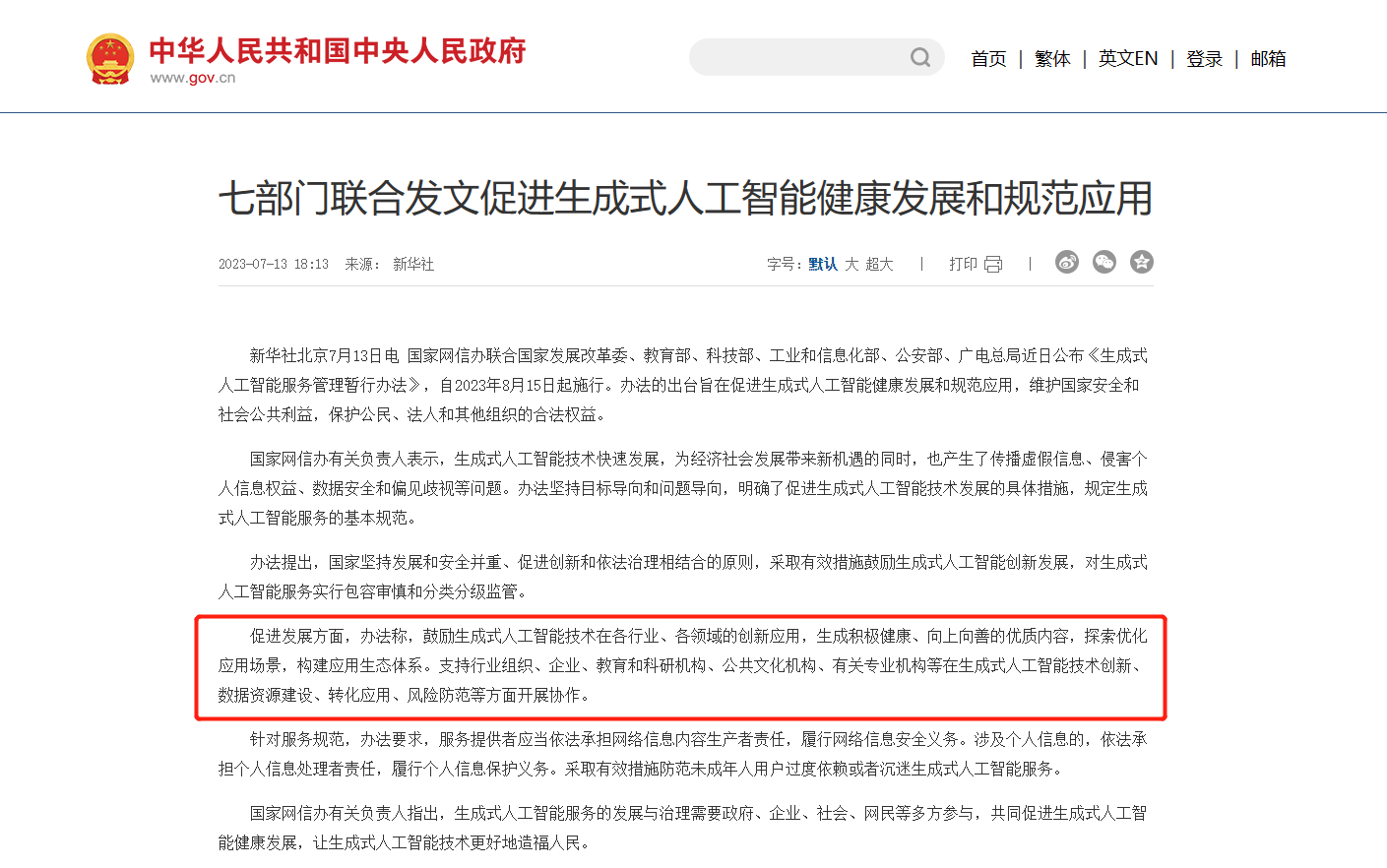 促進(jìn)發(fā)展方面,《辦法》稱,鼓勵(lì)生成式人工智能技術(shù)在各行業(yè)、各領(lǐng)域的創(chuàng)新應(yīng)用,生成積極健康、向上向善的優(yōu)質(zhì)內(nèi)容,探索優(yōu)化應(yīng)用場(chǎng)景,構(gòu)建應(yīng)用生態(tài)體系。支持行業(yè)組織、企業(yè)、教育和科研機(jī)構(gòu)、公共文化機(jī)構(gòu)、有關(guān)專業(yè)機(jī)構(gòu)等在生成式人工智能技術(shù)創(chuàng)新、數(shù)據(jù)資源建設(shè)、轉(zhuǎn)化應(yīng)用、風(fēng)險(xiǎn)防范等方面開(kāi)展協(xié)作。