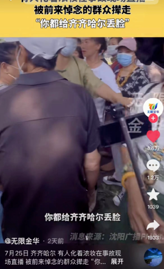 悼念現(xiàn)場(chǎng),有人發(fā)現(xiàn),竟有人化著濃妝,在事故現(xiàn)場(chǎng)直播。