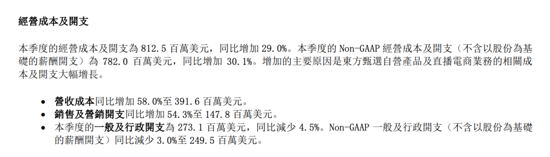 財報顯示,新東方在2023財年第四季度(2023年3月-5月)的經(jīng)營成本及開支為8.1億美元,同比增加29.%。其中,銷售及營銷開支同比增加54.3%達到1.48億美元;營收成本同比增加58%達到3.9億美元。增長的主要原因則指向了東方甄選自營產(chǎn)品及直播電商業(yè)務的相關成本及開支大幅增長。