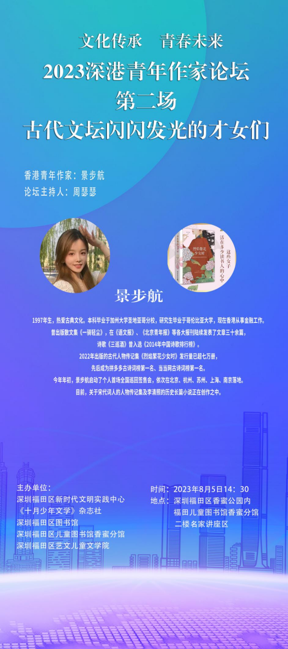 周瑟瑟說:“2023年夏天,福田區(qū)聚集了深港青年作家。我們在香蜜公園舉辦了深港青年作家論壇系列活動。深港青年作家王諾諾、景步航和黃子真在第一次論壇上進(jìn)行了對話。他們整體呈現(xiàn)了福田區(qū)和深港青年作家的創(chuàng)新活力。當(dāng)不同歷史時空的文學(xué)喚醒我們沉睡的心時,我們看到了不同人生命運(yùn)在當(dāng)代的價值,我們理解了古代文人和當(dāng)代青年作家?!?/p>