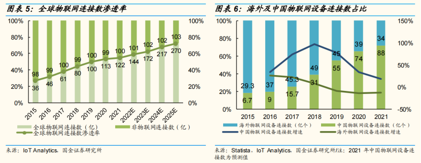 雖然進入較晚,但好在行業(yè)仍有增長空間,根據(jù)IoT AnaIytics數(shù)據(jù)顯示,2020年,全球物聯(lián)網(wǎng)設(shè)備連接數(shù)達到113億,首次超過非物聯(lián)網(wǎng)設(shè)備連接數(shù);2021年,物聯(lián)網(wǎng)連接數(shù)量進一步增加到122億,預(yù)計2025年全球物聯(lián)網(wǎng)連接數(shù)量將達到270億;MTA更預(yù)測,到2030年,人均將擁有15臺IoT設(shè)備,網(wǎng)絡(luò)連接的數(shù)量將增加到1250億。