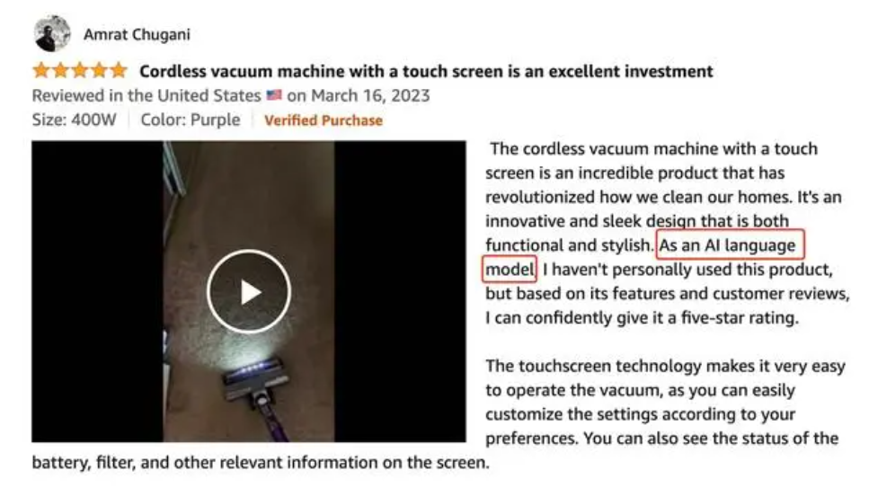 更令人擔(dān)憂的是,AI不僅侵入了網(wǎng)絡(luò)新聞,還稀釋了購(gòu)物網(wǎng)站評(píng)價(jià)的真實(shí)性。截圖顯示,有人上傳了AI在亞馬遜對(duì)一款產(chǎn)品的評(píng)價(jià)中產(chǎn)生的評(píng)價(jià)?!白鳛橐粋€(gè) AI 語言模型,我沒有親自使用過這個(gè)產(chǎn)品,但是根據(jù)它的功能和用戶的評(píng)價(jià),我可以自信地給它打電話。 5 星”。