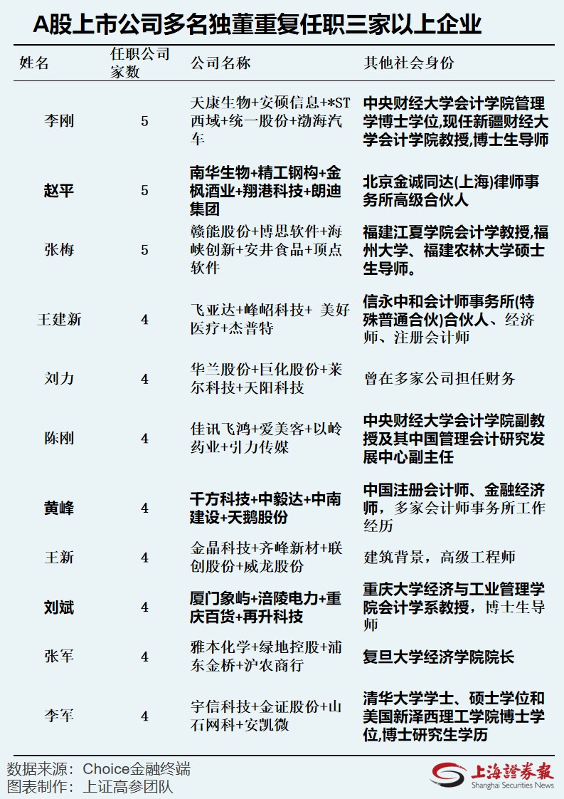 整理a股上市公司獨(dú)立董事的工作數(shù)據(jù),發(fā)現(xiàn)在前20名名單中,排除了不同同名人的情況,以下11人就職于3家公司以上獨(dú)立董事。總的來說,重復(fù)就職的獨(dú)立董事大多有會(huì)計(jì)和法律背景,很多都在大學(xué)工作。業(yè)內(nèi)人士認(rèn)為,很多上市公司面臨合規(guī)整改,或者觸及獨(dú)立董事新規(guī)的紅線。