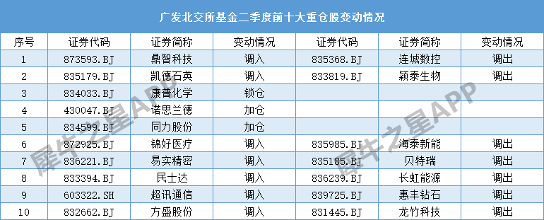 今年以來,廣發(fā)基金收益6.27%,第二季度前十大重倉股市值為2.55億元,比第一季度的2.43億元同比增長4.62%。二季度基金對重倉股的調(diào)整幅度較大,將連城數(shù)控、穎泰生物、海泰新能(835985985).BJ)等待七只股票調(diào)出前十。七只股票,如鼎智科技、凱德石英、民士達(dá)等。除了康普化學(xué)鎖倉之外,諾思蘭德(430047.BJ),同力股權(quán)(834599.BJ)。