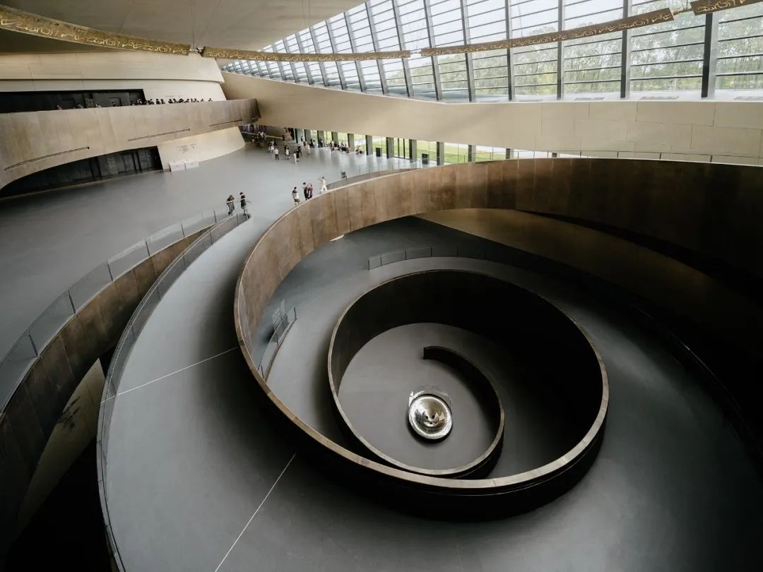 兩個(gè)巨大的建筑構(gòu)件成為空間焦點(diǎn)。時(shí)空螺旋斜坡是一個(gè)非常宏偉的場(chǎng)景。應(yīng)該是世界博物館最大的單點(diǎn)支撐螺旋斜坡,向地面10米深處旋轉(zhuǎn),連接每一層。