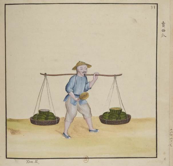 賣西瓜(黃肉,粉紅肉) 資料來源:《清國(guó)京城景風(fēng)俗圖》,第二冊(cè),19世紀(jì)。
