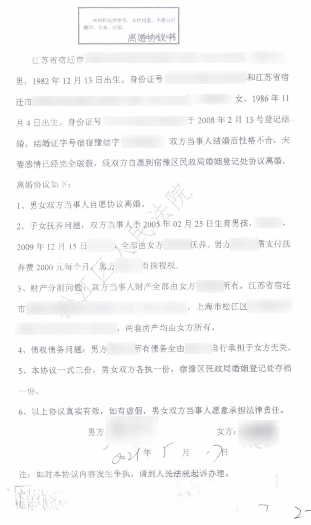 周某與田某的離婚協(xié)議。圖片由上海松江法院提供