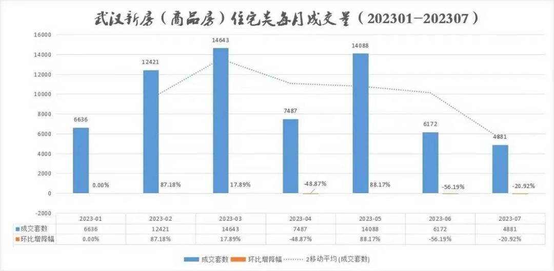根據(jù)武漢市住房保障和房管局官網(wǎng)的數(shù)據(jù)分析,2023年1-7月,武漢市新建住房成交量為66328套,較去年同期下降9%。數(shù)據(jù)顯示,在市場需求側(cè)政策的照顧下,市場趨勢并未得到挽救。