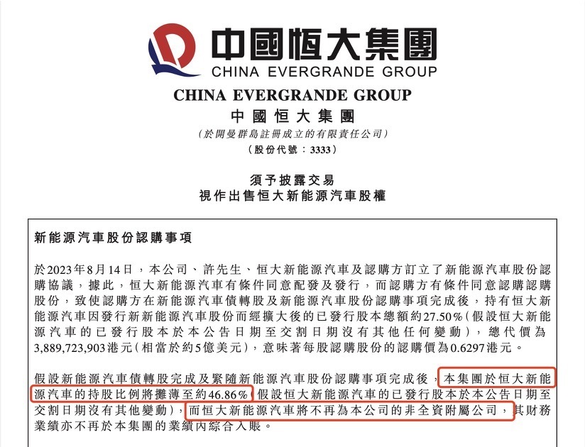 隨后,中國恒大(33333).HK)公告稱:恒大汽車持股比例將攤薄至46.86%左右,事件發(fā)生后,恒大汽車不會成為非全資附屬公司。