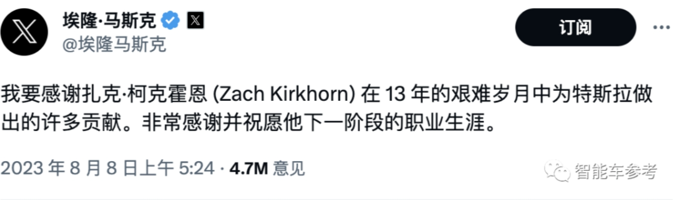 扎克隨后在領(lǐng)英上對此進行了回應(yīng),稱為自己13年來的工作而感到自豪,對特斯拉和馬斯克表達了感謝。