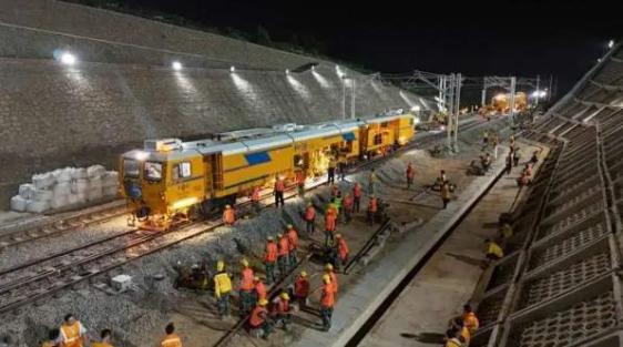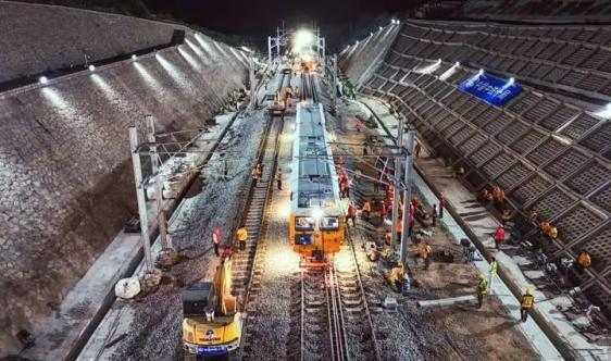 根據(jù)中鐵十局項目分部主管嚴(yán)凡磊的說法,這次插入式道岔的施工是在14.2‰在上坡道路上,整組道岔橫移6米,縱移196米,再次橫移4.5米,創(chuàng)造了中國第一個大坡度、遠(yuǎn)距離縱移和42號道岔人手動插入的新紀(jì)錄。