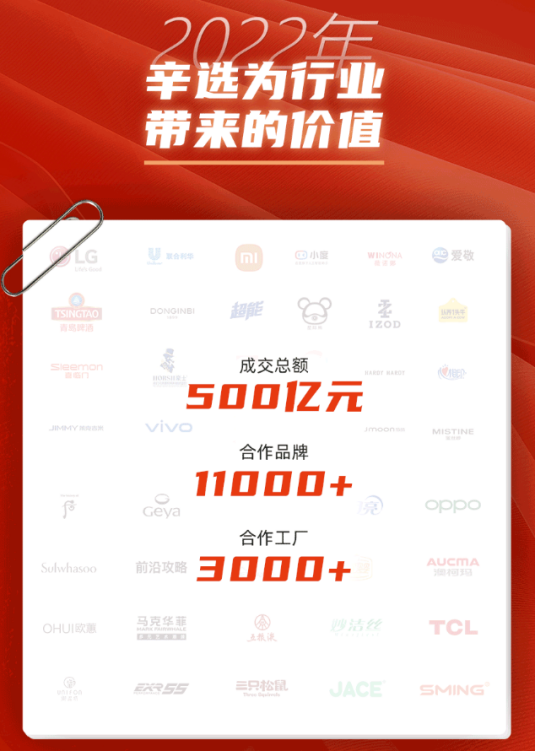 8月14日,辛選集團發(fā)布了2022年的總結(jié)報告。數(shù)據(jù)顯示,辛選2022年成交總額達到500億元,合作品牌超過11000個,合作工廠超過3000家。