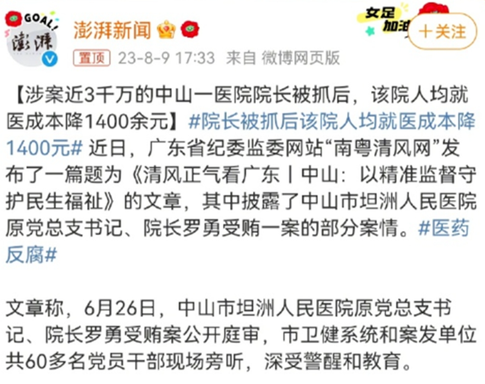 僅僅他一個人被查,這家醫(yī)院的人均就醫(yī)成本就下降了1400元。
