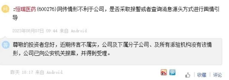 8月9日晚,面對投資者的頻頻追問,恒瑞醫(yī)藥一再回應后最終表示:“近期傳言不屬實,公司及下屬分子公司、及所有派駐機構沒有該情形,公司已向公安機關報案,并得到受理?!?/span>
