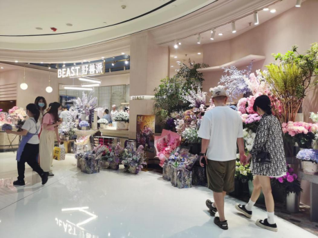 8月22日13時(shí)許,在上海浦東新區(qū)的街道上,記者注意到,許多外賣(mài)騎手不僅帶著印有奶茶或晚餐包裝的外賣(mài)進(jìn)入辦公樓,還帶著許多鮮花匆匆掠過(guò)。進(jìn)入商場(chǎng)后,許多花店里整齊地排列著包裹好的鮮花,店員們?nèi)匀幻χx擇枝葉為后續(xù)訂單做準(zhǔn)備。