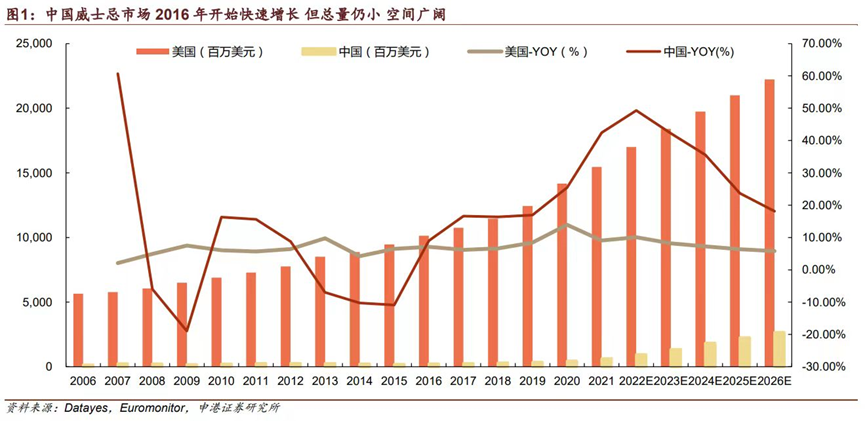 中國威士忌市場規(guī)模預(yù)測 來源:申港證券