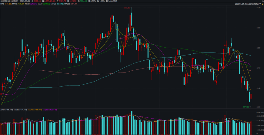 盤內(nèi)消息表面沒有超出預(yù)期的信息。八月十八日盤后,證監(jiān)會(huì)發(fā)布消息,計(jì)劃在投資、融資、交易等方面推出一攬子政策措施,以激活金融市場。但市場指數(shù)并未站穩(wěn),情緒反應(yīng)滯后,8月21日盤中,指數(shù)一度跌破3100點(diǎn)。8月22日,盤中指數(shù)進(jìn)一步下跌,接近年內(nèi)新低。上證指數(shù)最低報(bào)告為3074.53點(diǎn),接近年初指數(shù)最低報(bào)告為3073.05點(diǎn)。三大指數(shù)中的深圳成指和創(chuàng)業(yè)板年線已經(jīng)成為負(fù)線。